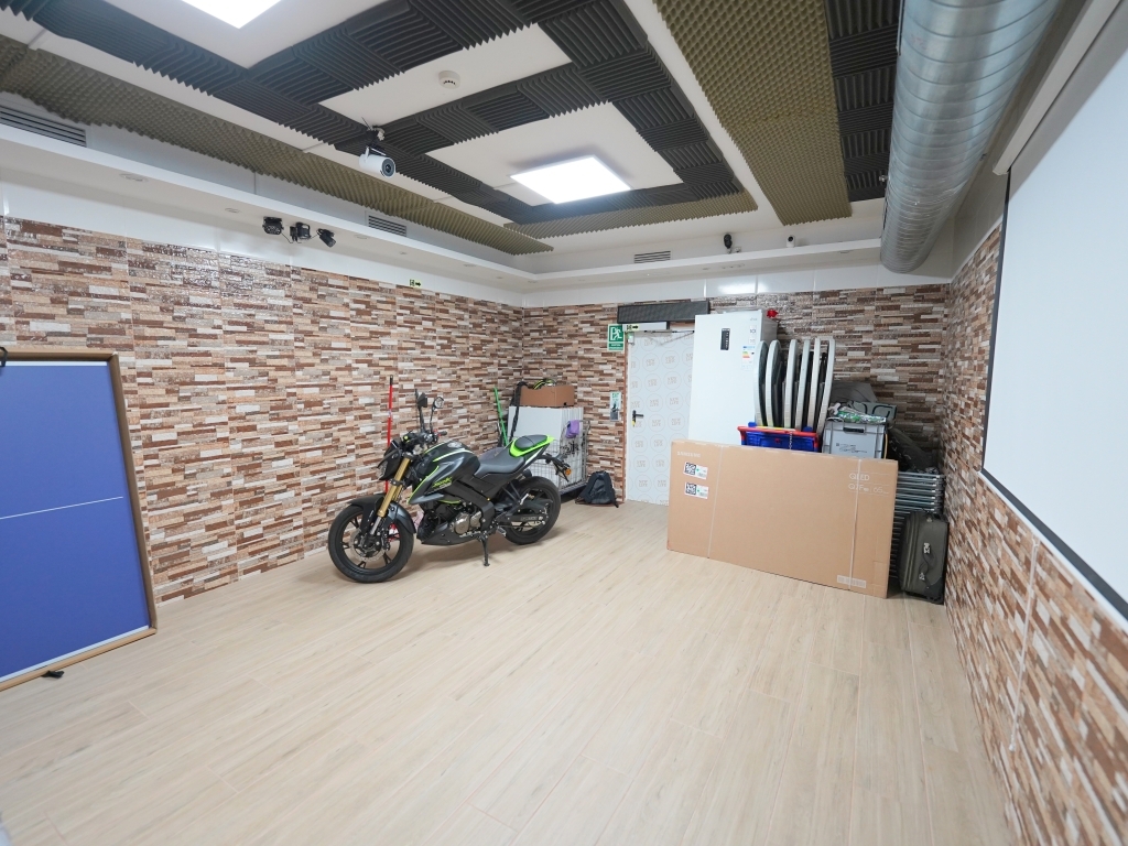 - Espacio totalmente insonorizado tanto techos y paredes, dividido en dos espacios independientes para ofrecer amplias posibilidades de música integrada y distribuido por un cajón de pladur que recurre de forma complementaria al techo acústico.
